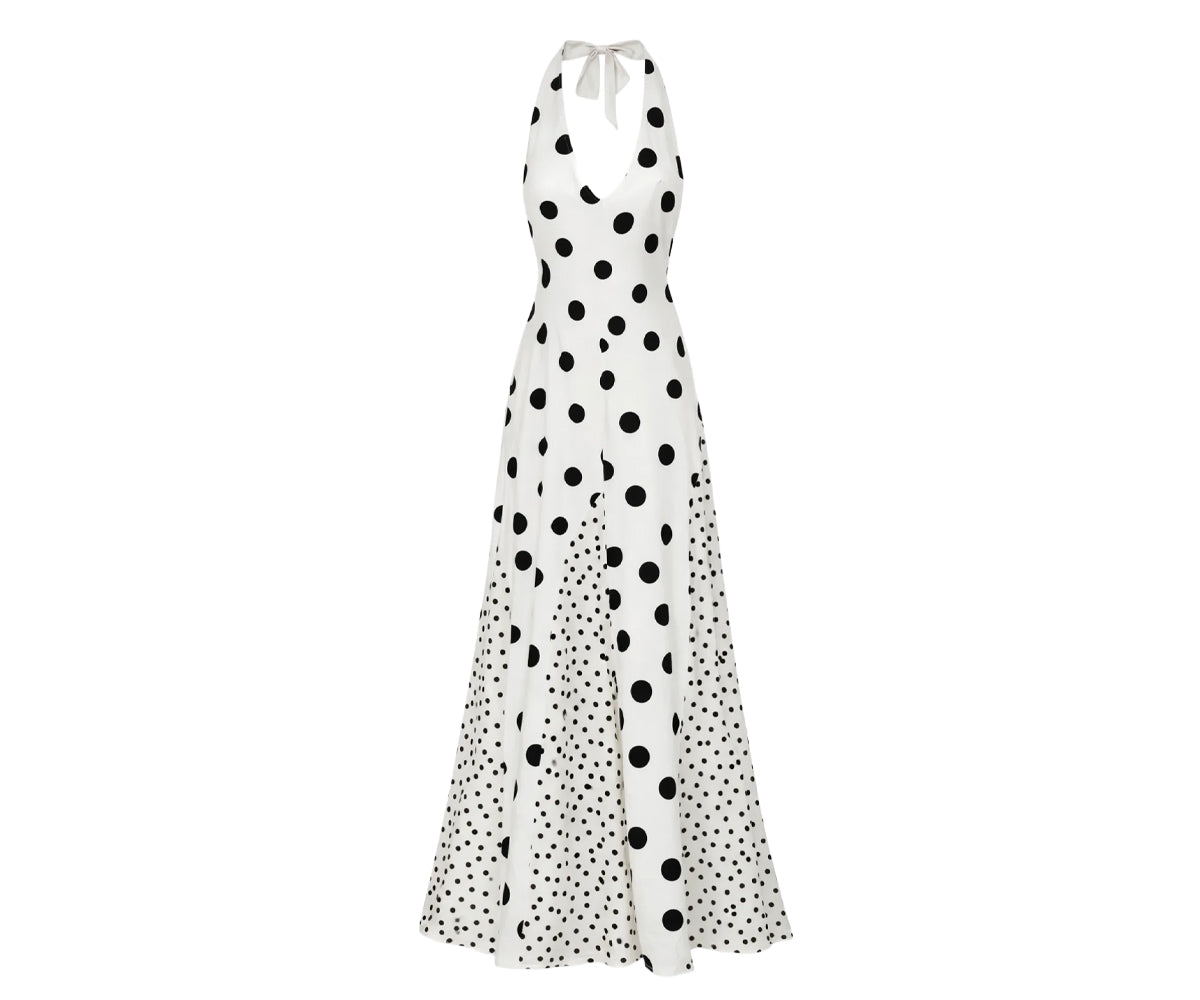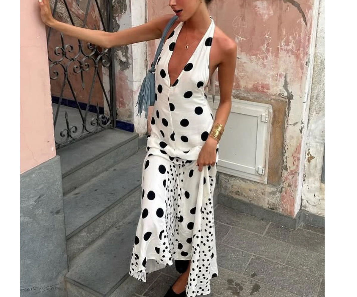 Abito lungo con scollo all'americana, profonda scollatura a V e schiena scoperta.