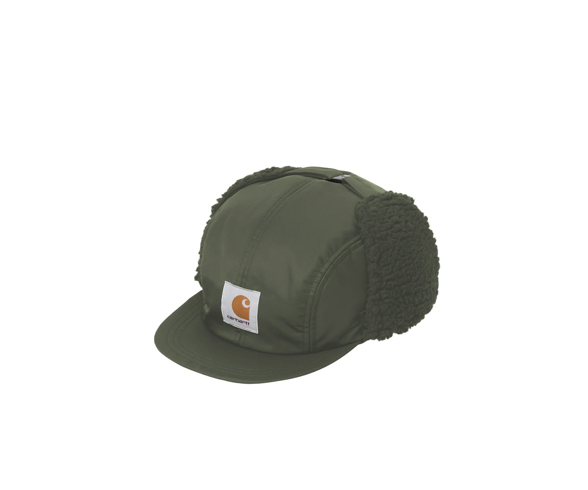 Il berretto con paraorecchie Oltera è un modello non strutturato a quattro pannelli, realizzato in tessuto di nylon di peso medio. Il modello presenta paraorecchie foderati in pile che possono essere fissati sulla parte superiore del cappello con una fibbia. Un'etichetta quadrata in tessuto è presente sul davanti.