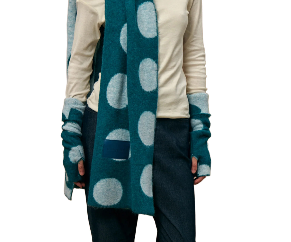 Guanti in maglia Marieta con motivo a pois nei toni del blu e dell'acquamarina. Morbidi, leggeri e caldi, perfetti per proteggere le mani e aggiungere un tocco di colore e stile al tuo outfit invernale.