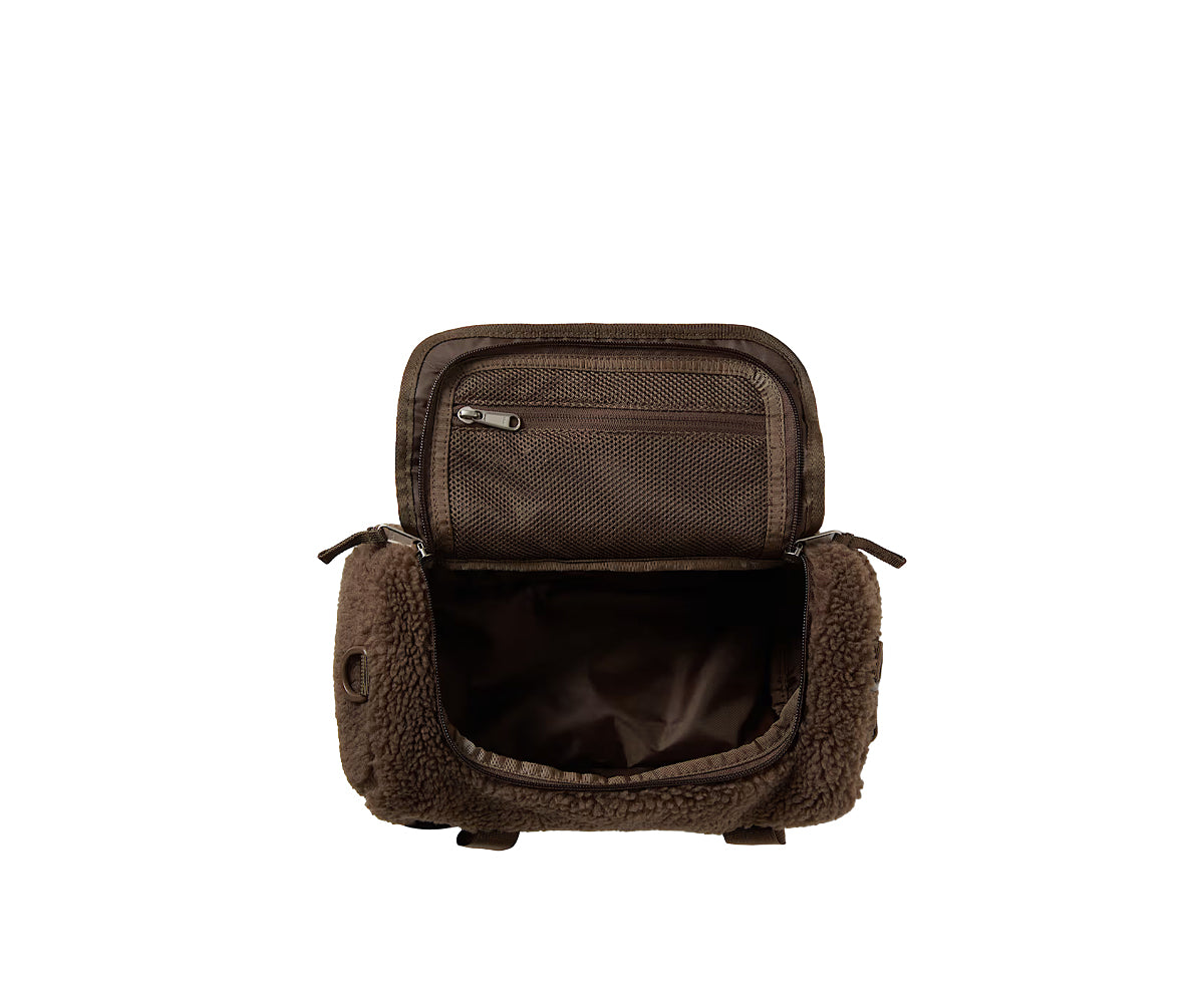 - Iconica silhouette Base Camp in versione mini in pile a pelo lungo