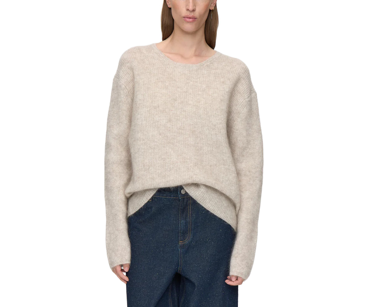 Calaha è un elegante capo in maglia femminile, realizzato in un mix di 33% mohair, 33% lana, 30% nylon e 4% elastan, per un capo morbido, caldo ed elastico. Il capo ha una vestibilità regolare, spalle scese, scollo rotondo e lavorazione a coste.