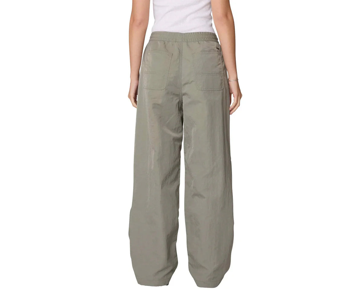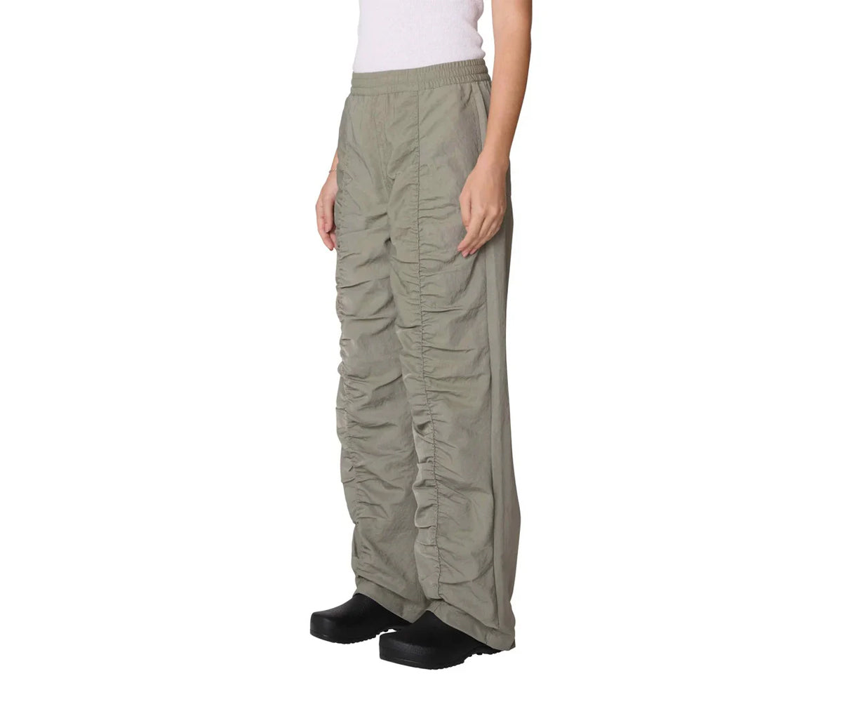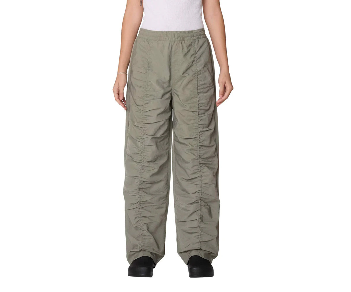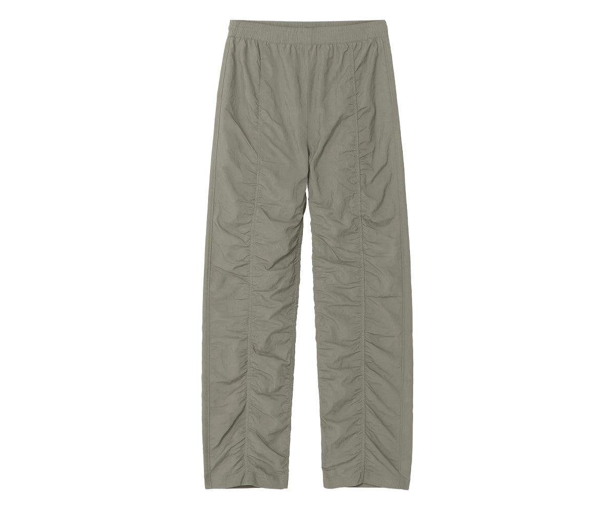Pantaloni in nylon con gamba dritta, vestibilità ampia e vita elasticizzata. Presentano arricciature lungo la cucitura anteriore, finta patta, tasche anteriori con cucitura e tasche posteriori applicate.