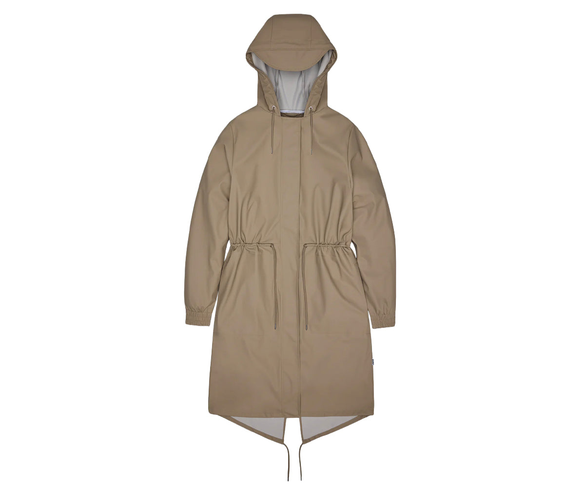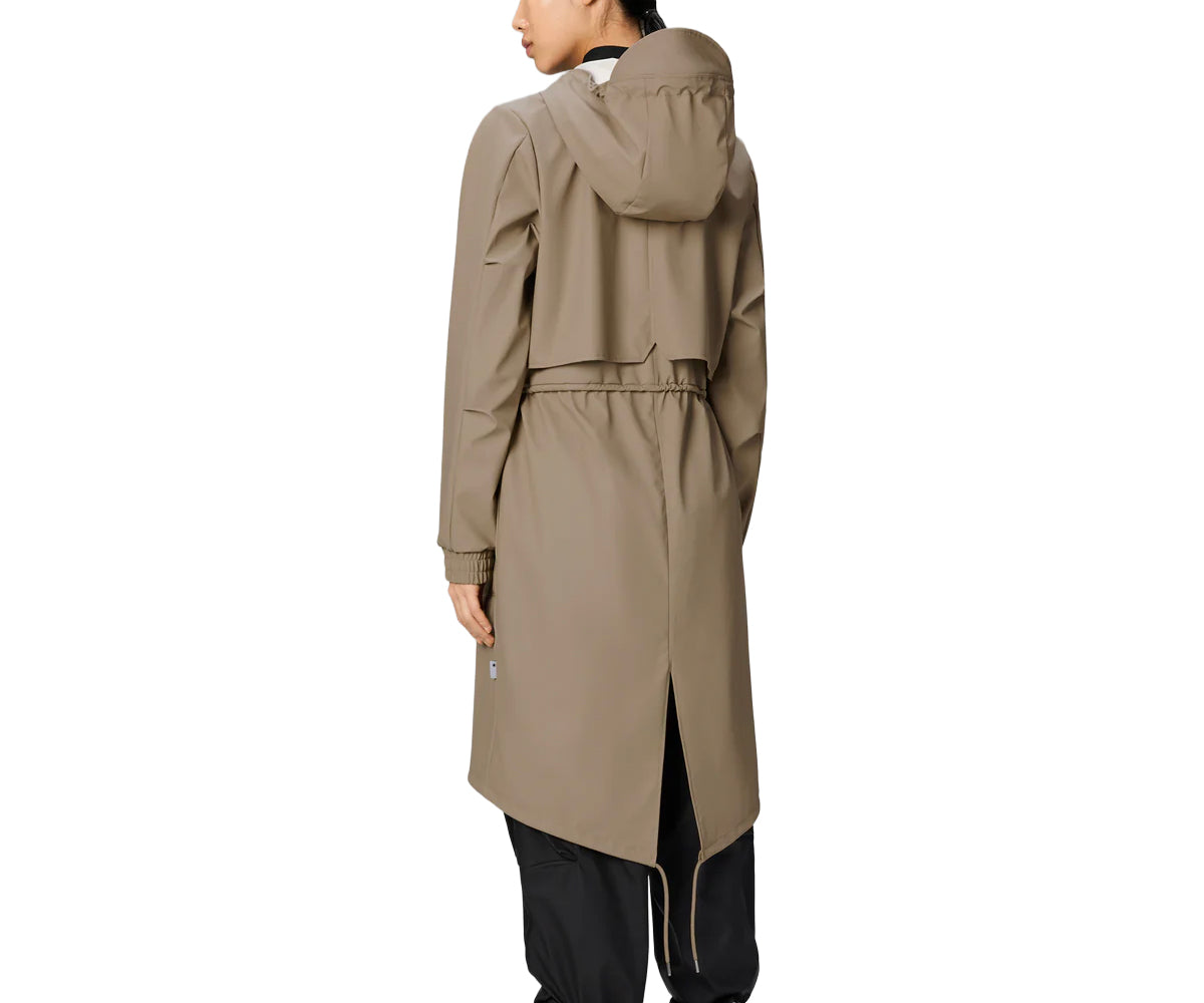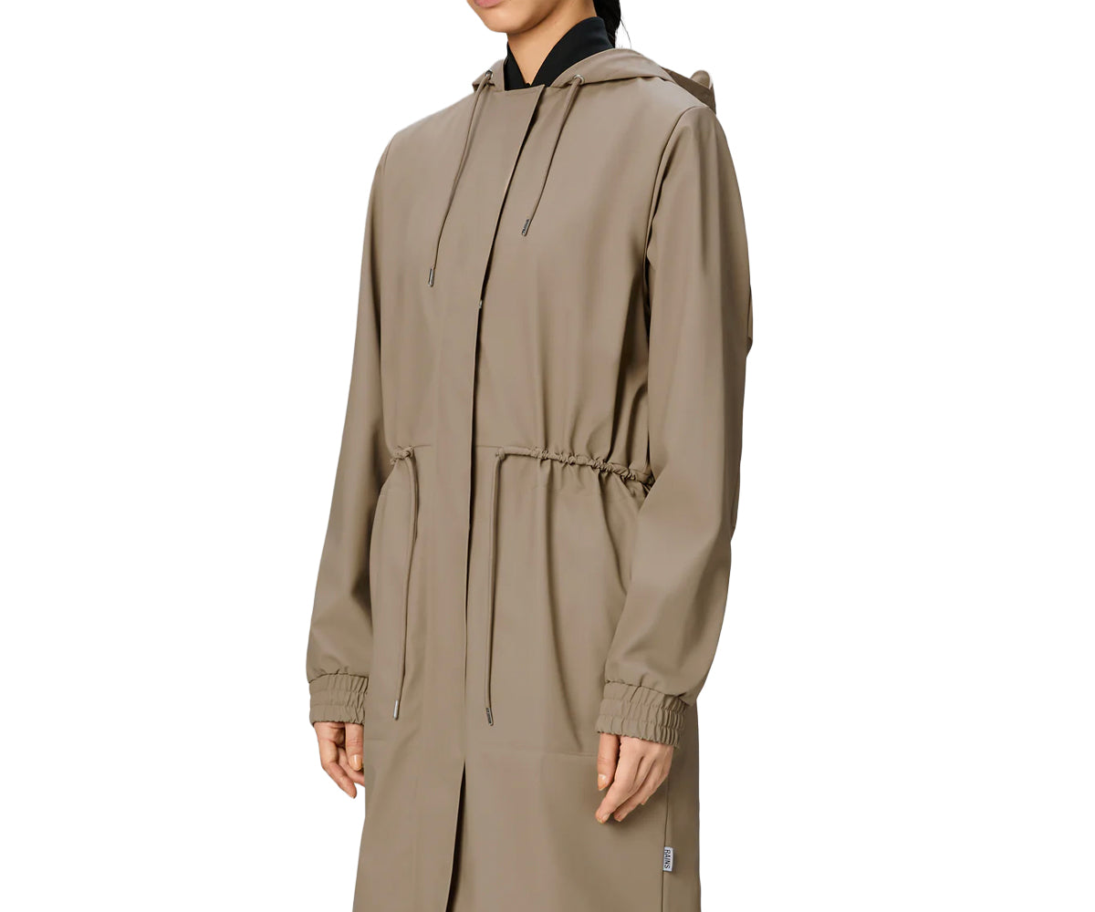 Lo String W Parka è realizzato nell'iconico tessuto PU di Rains e presenta cuciture nastrate. La mano è leggera, con un drappeggio elegante e morbido al tatto.