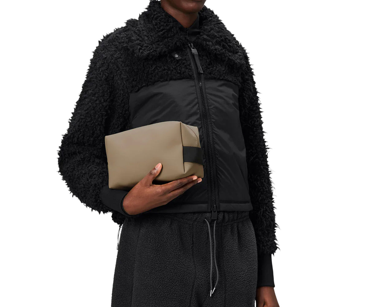 La Wash Bag Small è realizzata in tessuto PU impermeabile firmato Rains, progettato per essere robusto, duraturo e piacevole al tatto.