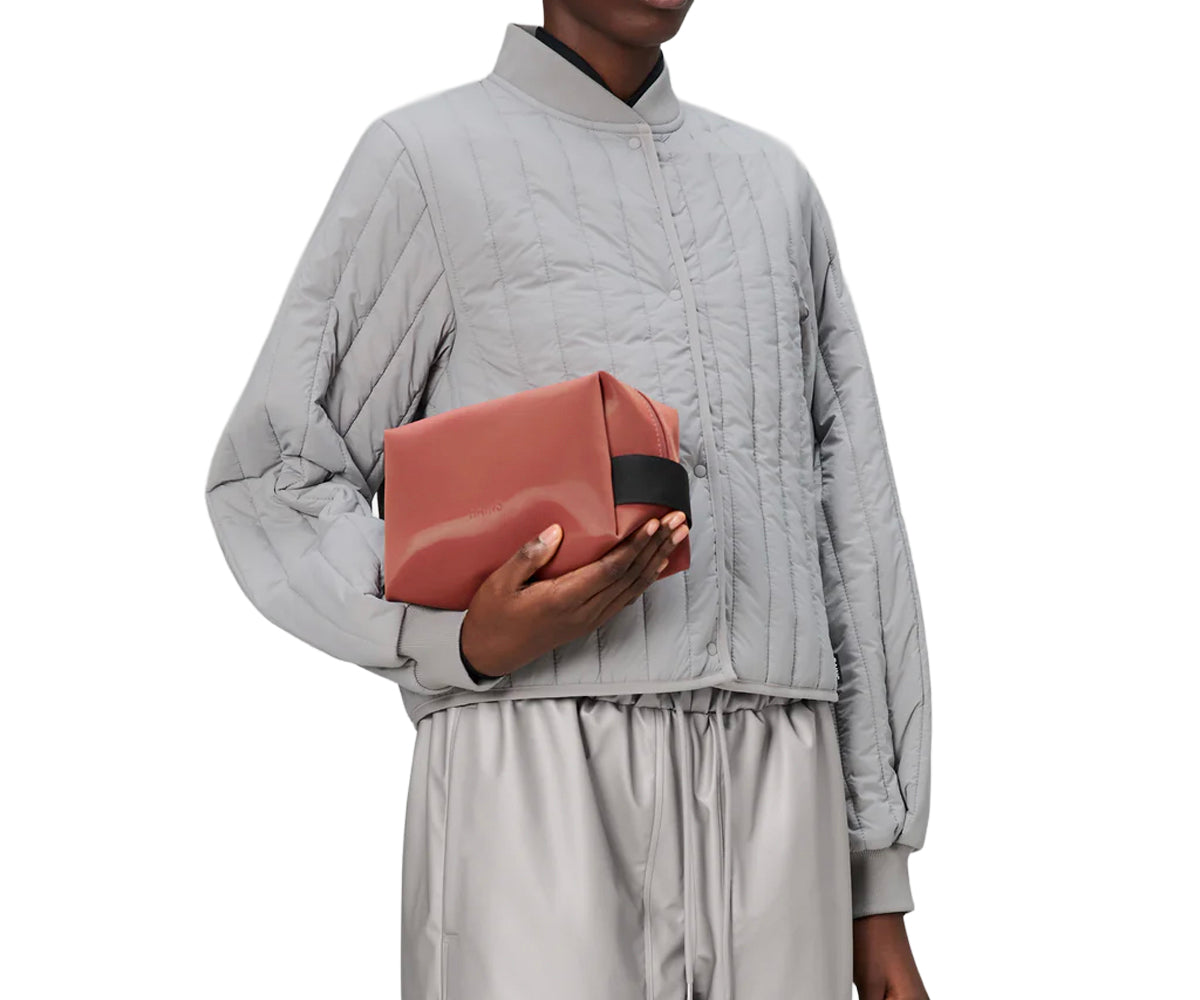 La Wash Bag Small è realizzata in tessuto PU impermeabile firmato Rains, progettato per essere robusto, duraturo e piacevole al tatto.