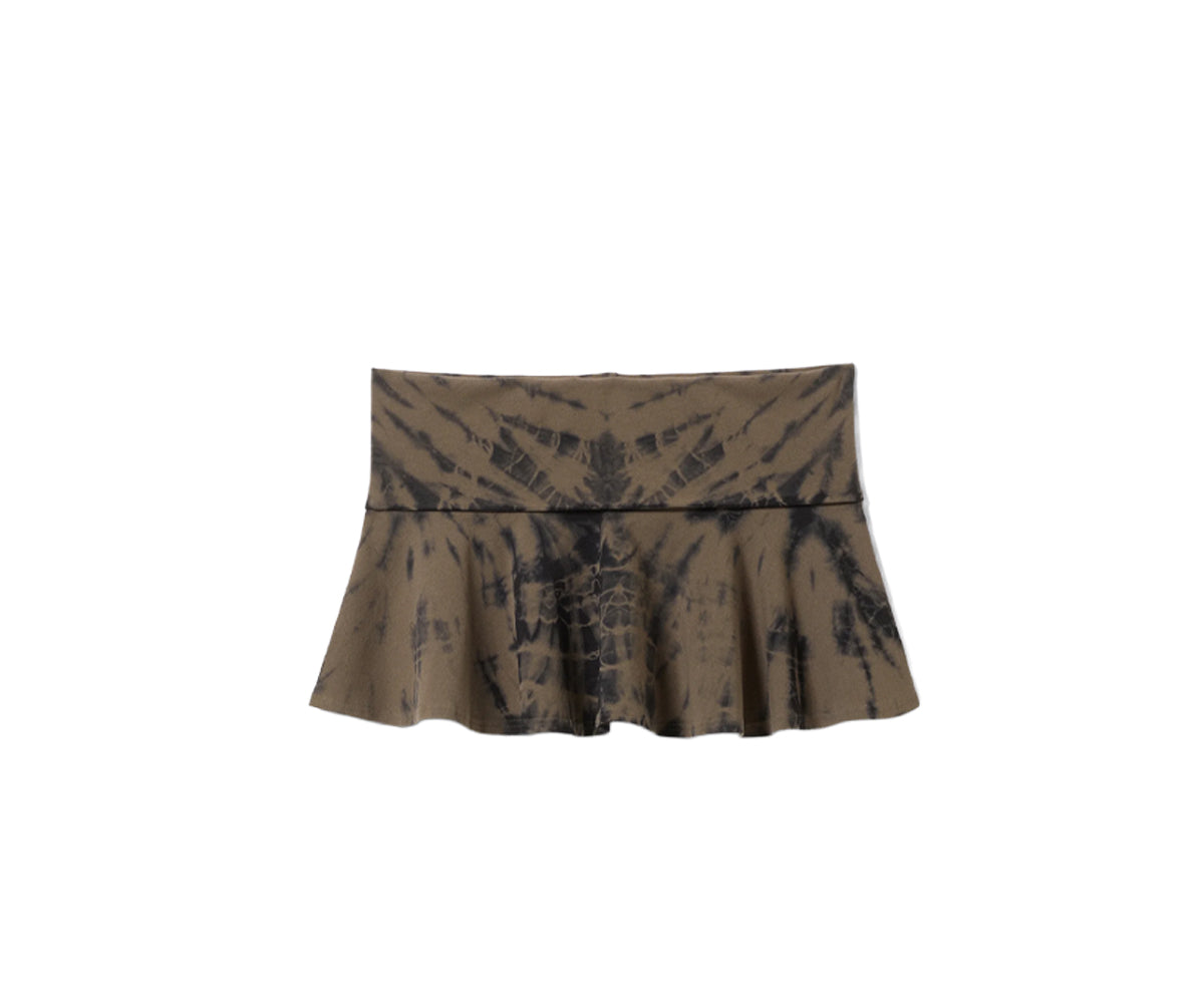 Minigonna a vita bassa con vestibilità attillata e orlo svasato. Realizzata in jersey di cotone elasticizzato, presenta una doppia fascia in vita e una stampa tie-dye su tutta la superficie.